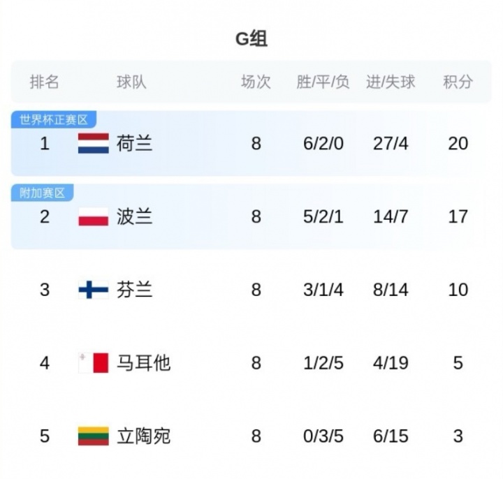 G组除了荷兰头名晋级,第二名波兰进入附加赛。