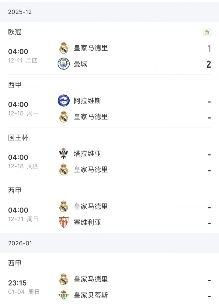 12月11日讯 皇马1-2不敌曼城,球队近8场比赛2胜3平3负。