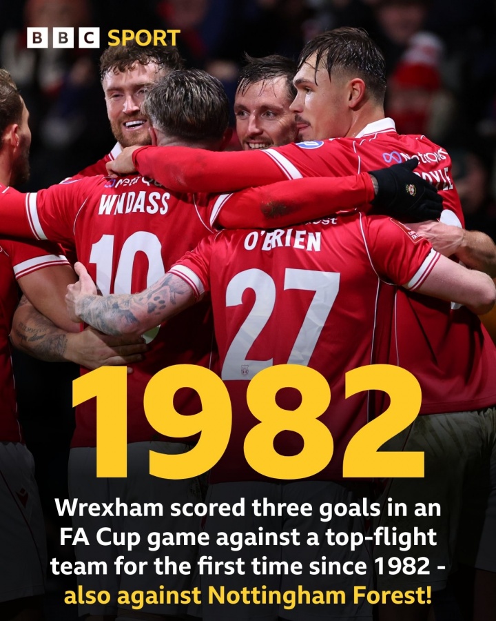 上一次雷克瑟姆在足总杯中对阵顶级联赛球队打进三球还要追溯到1982年,而好巧不巧那场比赛他们也是对阵森林(雷克瑟姆3-1获胜)。
